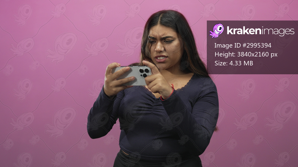 Plus size woman holding smartphone and pointing finger to screen against pink studio backdrop while frowning and tapping with hands; frustration problem solving. - Kraken Images