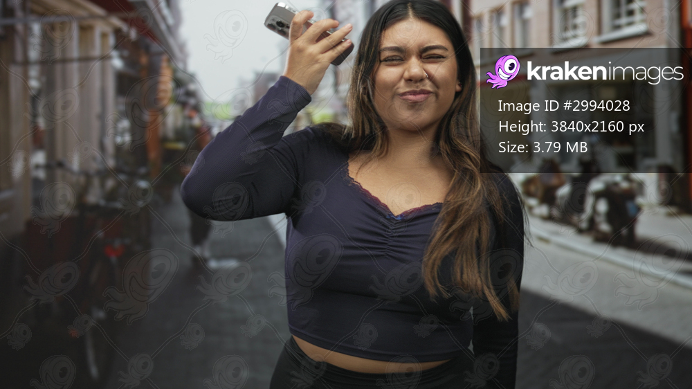 Plus size woman holding smartphone to head while grimacing amid urban shopping street with bicycles and storefronts in view; annoyance.