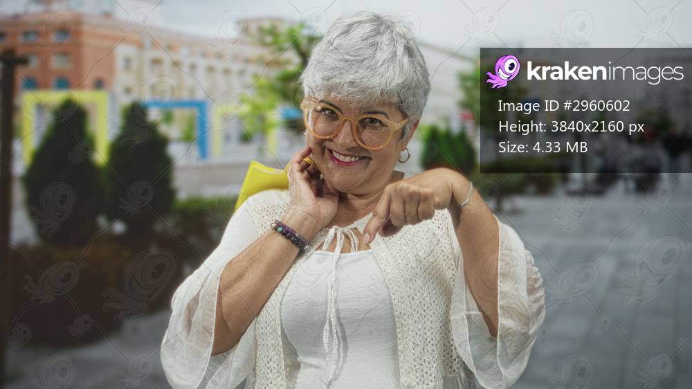Plus size woman holding yellow shopping bag over shoulder, pointing with hand on street, smiling and wearing glasses; confidence independence.