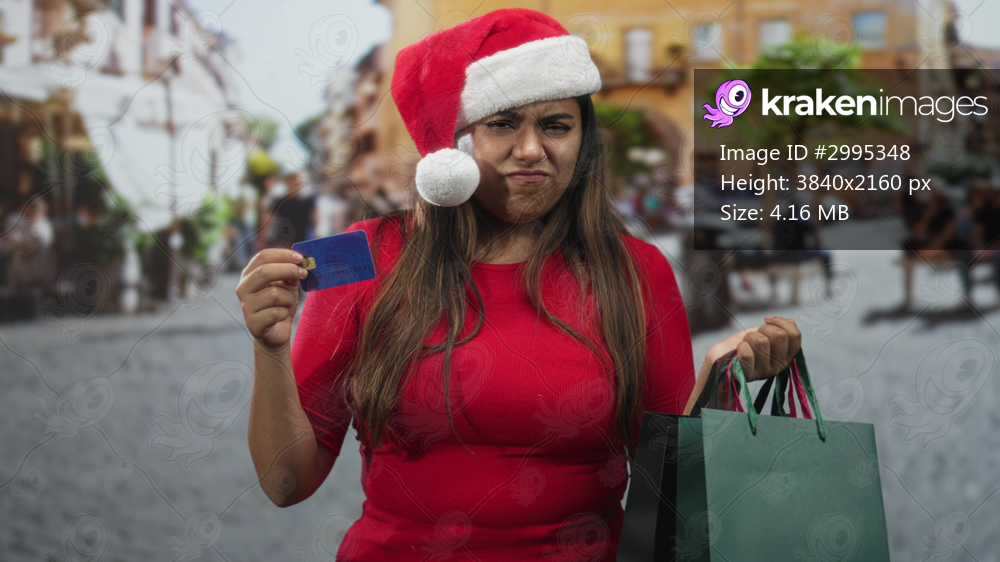 Plus size woman holds creditcard in one hand and shopping bags in the other on a busy street; holiday shopping frustration.