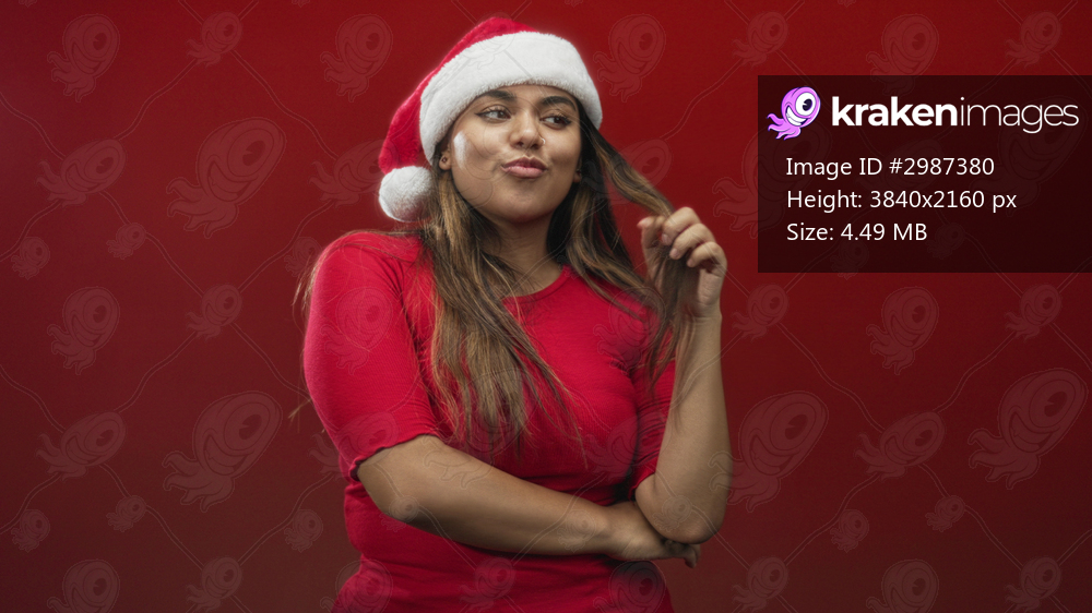 Plus size woman in santa hat crosses arms and twirls hair in studio wearing red top; holiday annoyance.