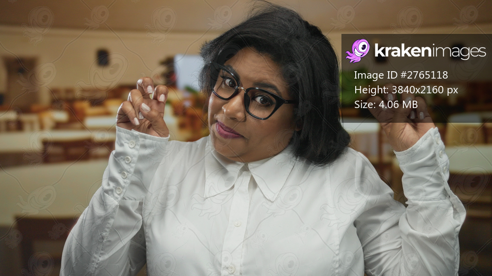 Plus size woman posing playfully with peace sign in elegant white shirt at cozy restaurant indoors exhibiting confidence and friendly demeanor.