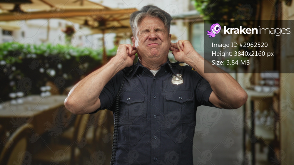 Police man with badge and radio plugs fingers into ears, grimacing, standing by street cafe tables and umbrellas near building facade; discomfort noise. - Kraken Images