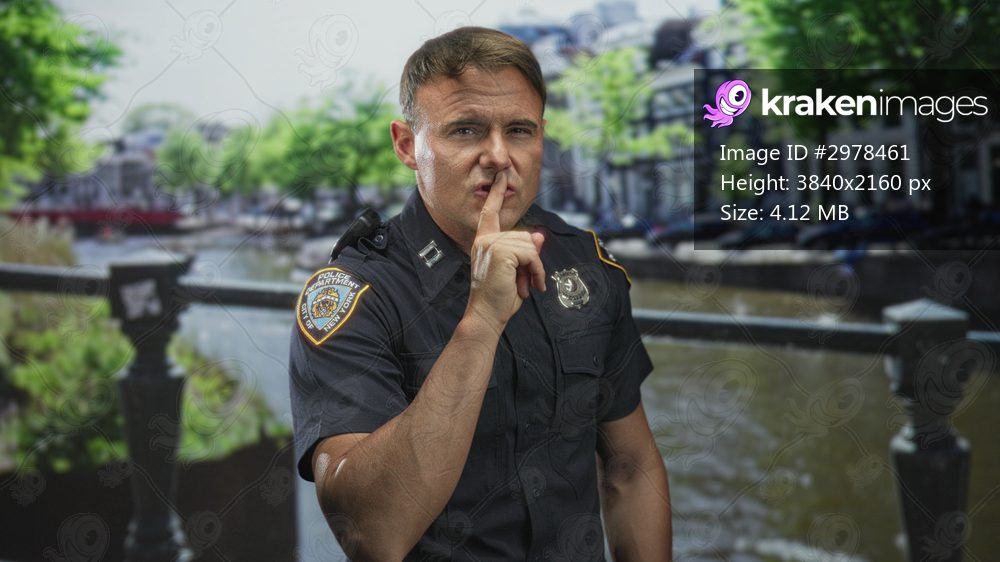 Police man finger to lips for silence on street by canal bridge and railing, badge visible; authority silence.