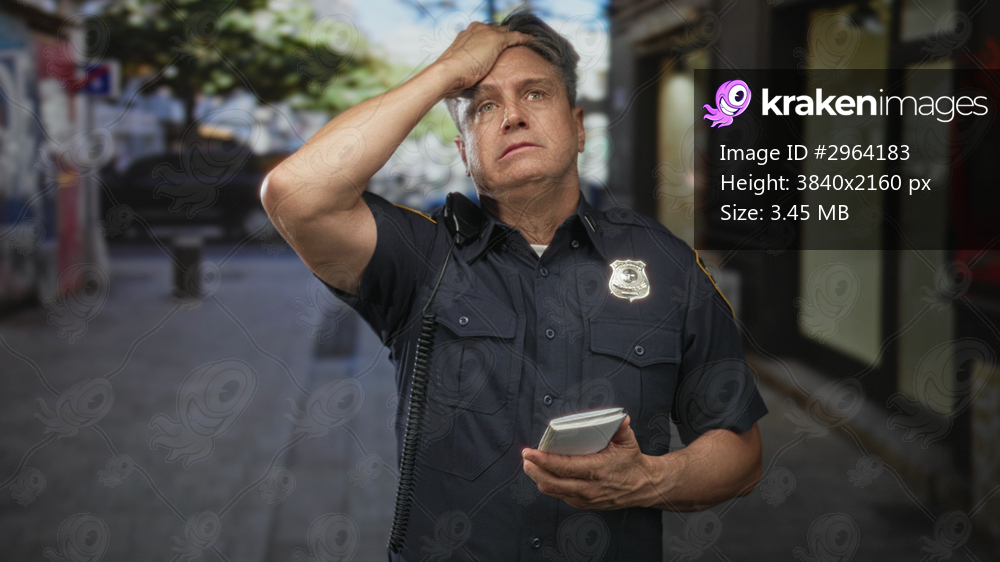 Police man holding notepad, hand on forehead in urban street with radio and badge visible; fatigue duty.