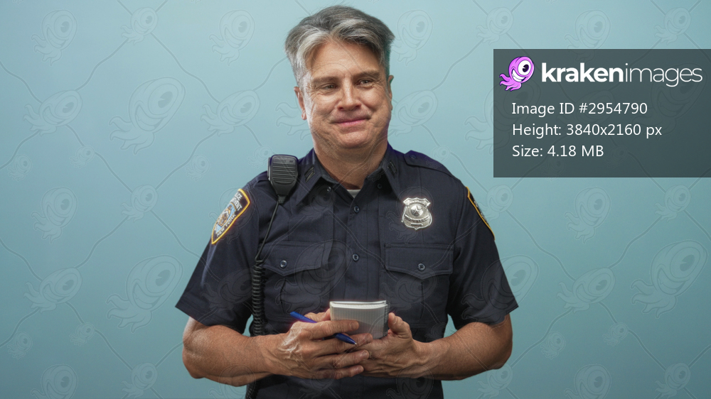 Police man holding notepad and pen, writing notes while smiling and checking a shoulder radio microphone in studio; pride duty.