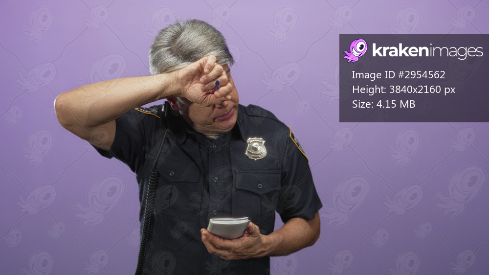 Police man holding notepad and radio cord, covering eyes with forearm against purple studio backdrop; fatigue concern.