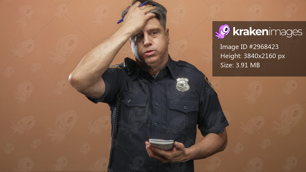 Police man in uniform holding a notepad and pen, touching forehead with hand, radio mic and badge visible, middleaged officer in a plain studio setting; duty fatigue. - Kraken Images
