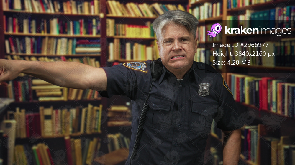 Police man points arm with badge and radio microphone visible amid booklined shelves in library; authority concern vigilance.