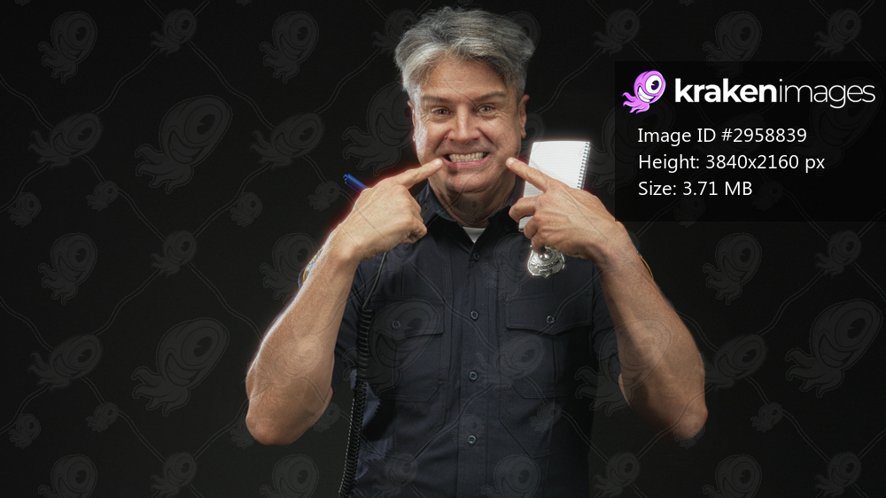 Police man points fingers to his teeth while holding a notepad and pen in studio; playful authority.