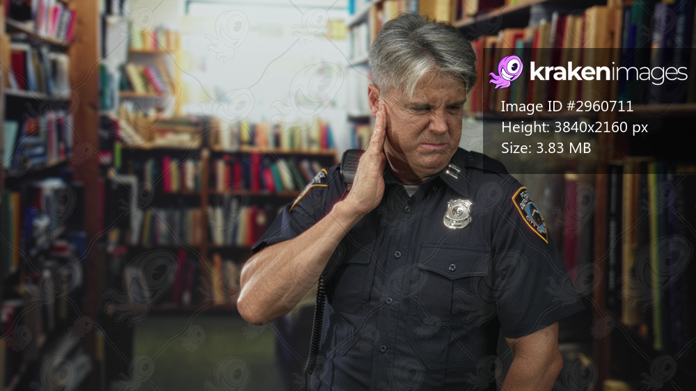 Police man presses hand to ear beside crowded bookshelves in library building, radio on shoulder and badge visible; pain.