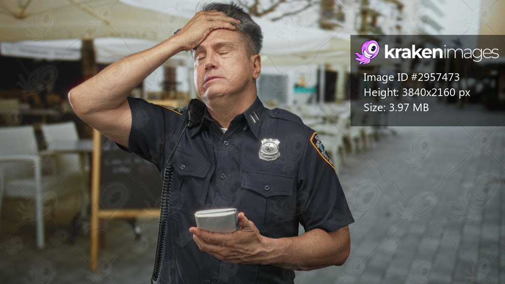 Police man writing in a notepad on a pedestrian street outside a cafe with umbrella tables and chalkboard, badged uniform and radio visible; duty focus. - Kraken Images