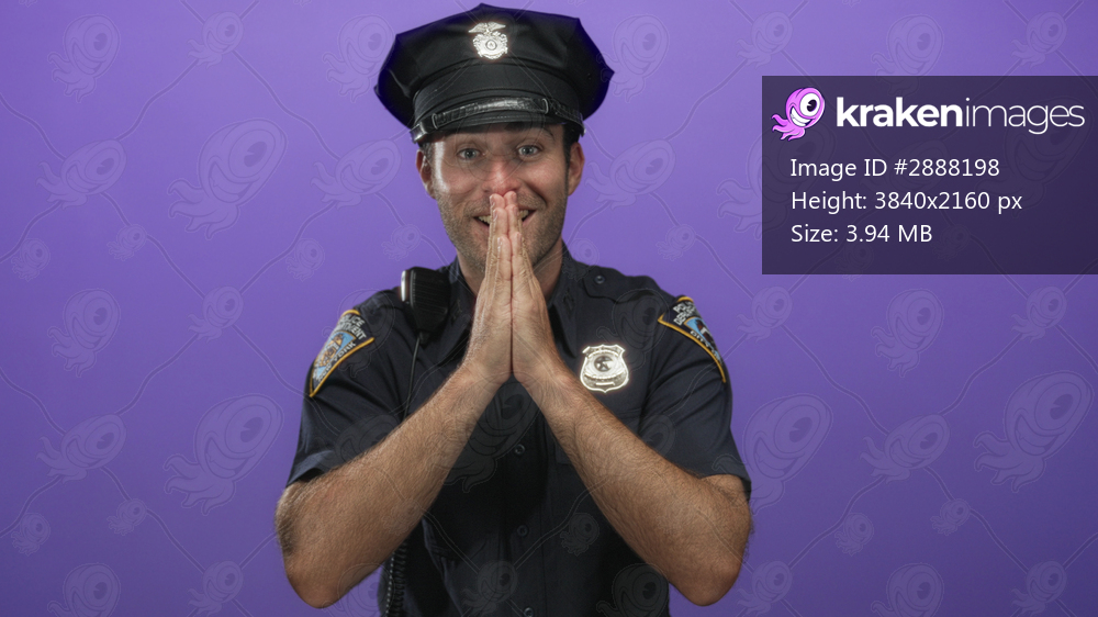 Police officer covers his eyes with hands, mouth open, wearing cap, badge and radio in a purple studio; playful surprise.