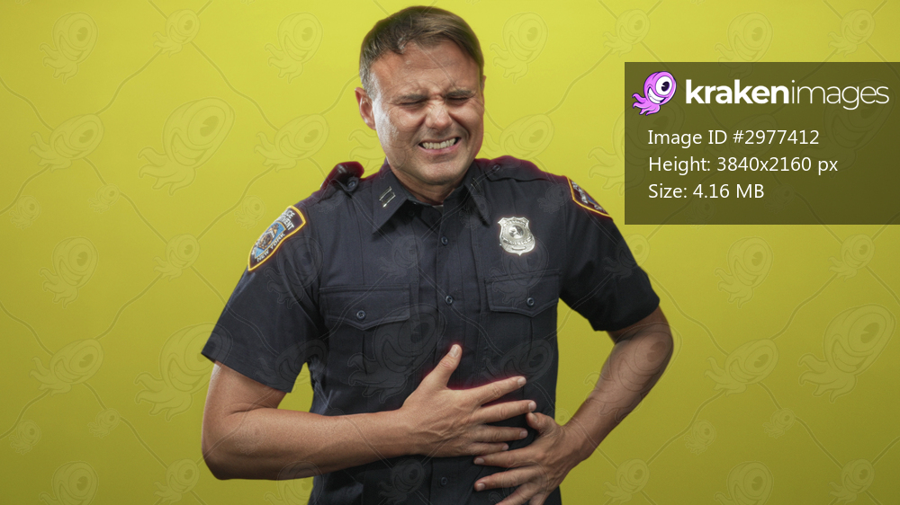 Police officer in navy uniform clutches chest with one hand, grimacing as if in pain on yellow studio backdrop; distress emergency.