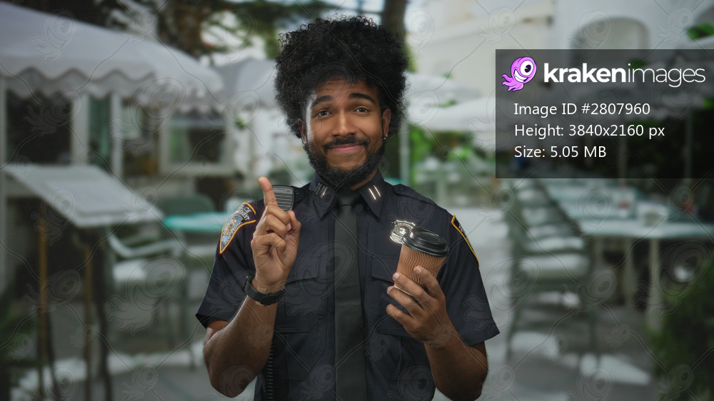 Police officer in uniform gestures while holding coffee on an outdoor restaurant terrace conveying a playful no with finger.