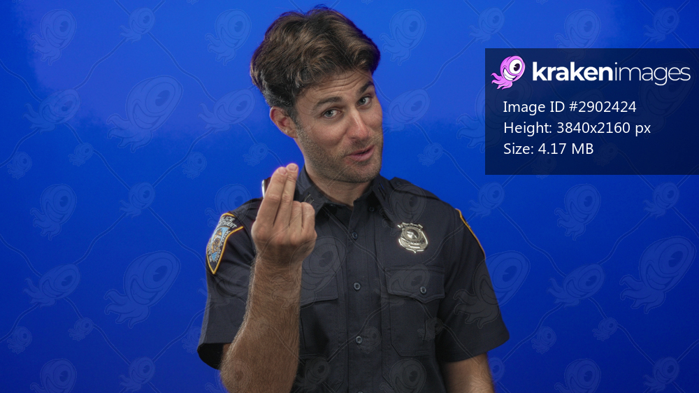 Police officer man beckoning with fingers and showing hands in blue studio; playful invitation confidence.
