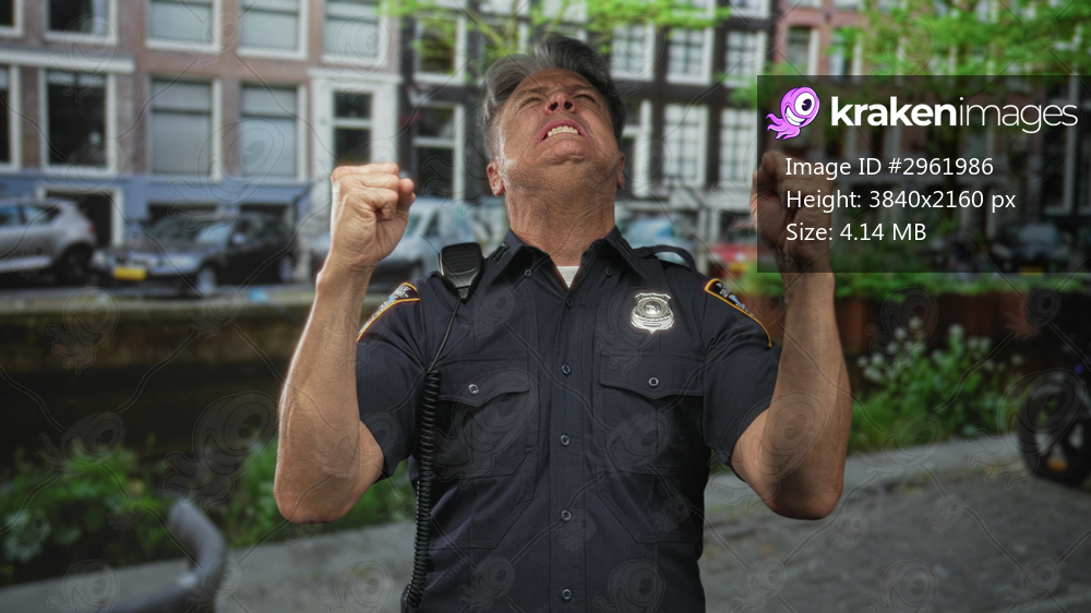 Police officer man with clenched fists and open mouth shouting, shoulder radio visible on canal street among buildings; frustration.