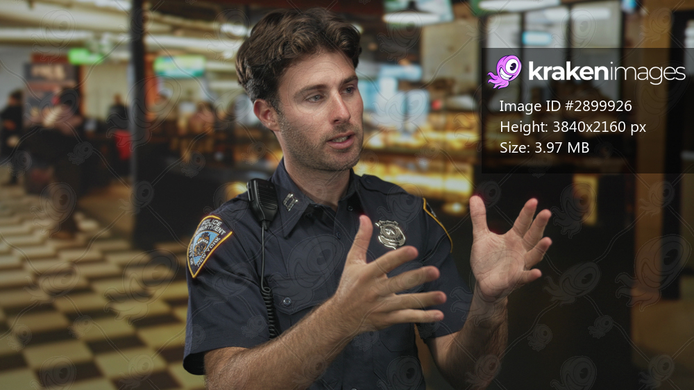 Police officer man gesturing hands in building restaurant interior with visible badge; public safety concern.