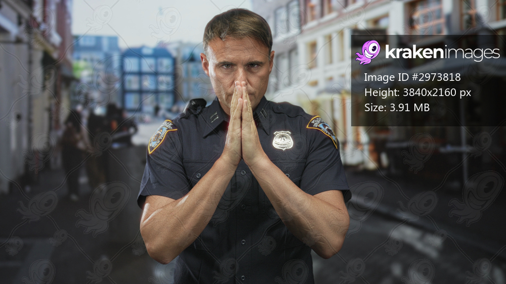 Police officer man with hands pressed together over his mouth on a busy street with storefronts and blurred crowd; concern reflection.