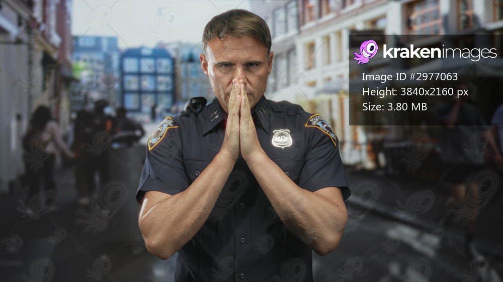 Police officer man with hands pressed together over his mouth on a busy street with storefronts and blurred crowd; concern reflection.