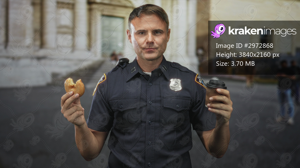 Police officer man holding bitten donut and coffee cup, tongue out, standing in front of building; casual break relaxed.