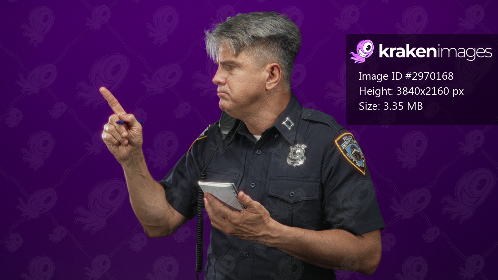 Police officer man holding notepad and pen, points finger while checking notes in studio; duty authority serious.