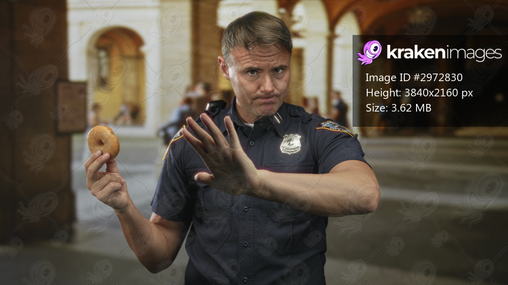 Police officer man holds glazed donut in one hand and shows open palm stop gesture with badge visible in building archway; duty stern.