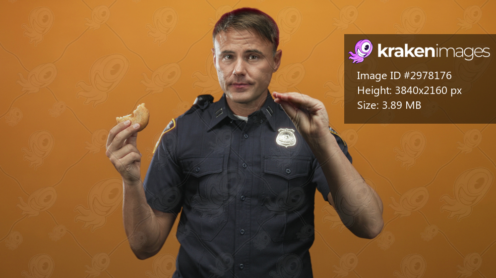Police officer man in navy uniform holding a bitten donut by his hand while making a flat measuring gesture toward camera against an orange studio backdrop; humor duty. - Kraken Images