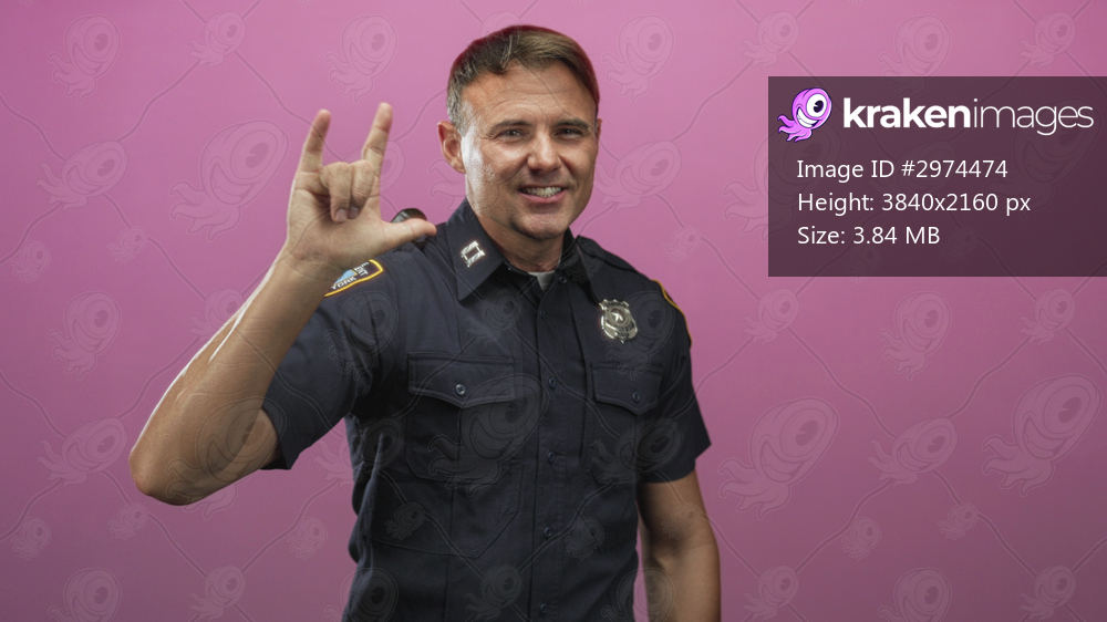 Police officer man in navy uniform holds up hand showing i love you sign with visible badge in pink studio; pride duty.