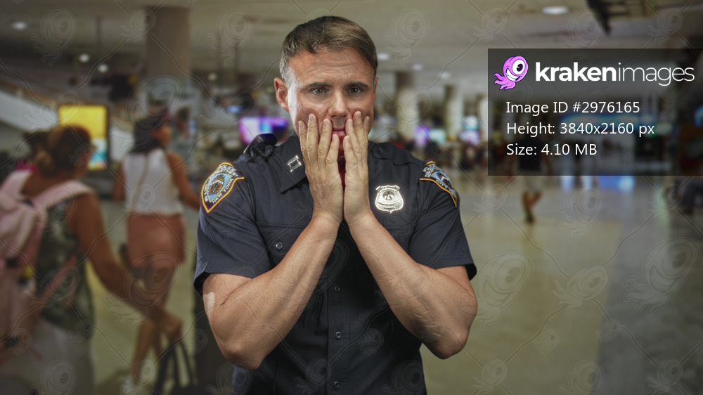 Police officer man in uniform with badge, hands covering mouth and palms near face amid travelers and luggage in airport terminal; concern duty.