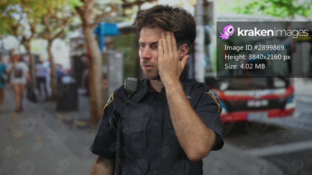 Police officer man in uniform with radio and badge holding hand to forehead on busy city street near bus and trees; concern.
