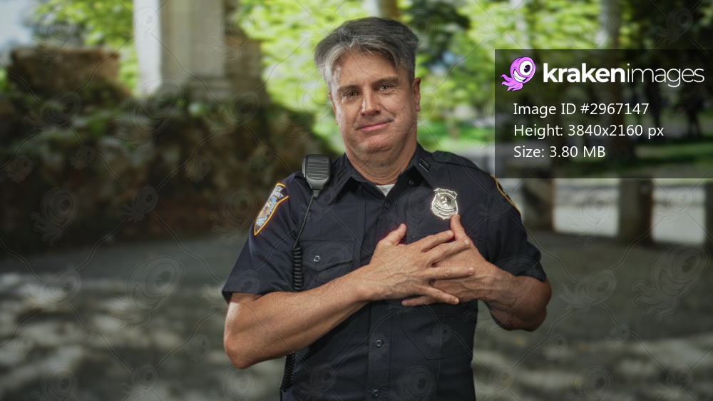 Police officer man middle aged clutching chest, badge and radio visible, apparent heartattack while standing in public park with stone benches; duty concern. - Kraken Images
