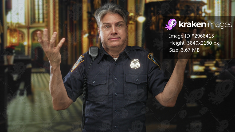 Police officer man middle aged grey hair, badge and radio visible, raises both hands with open palms amid ornate interior of a building; anxiety urgency. - Kraken Images