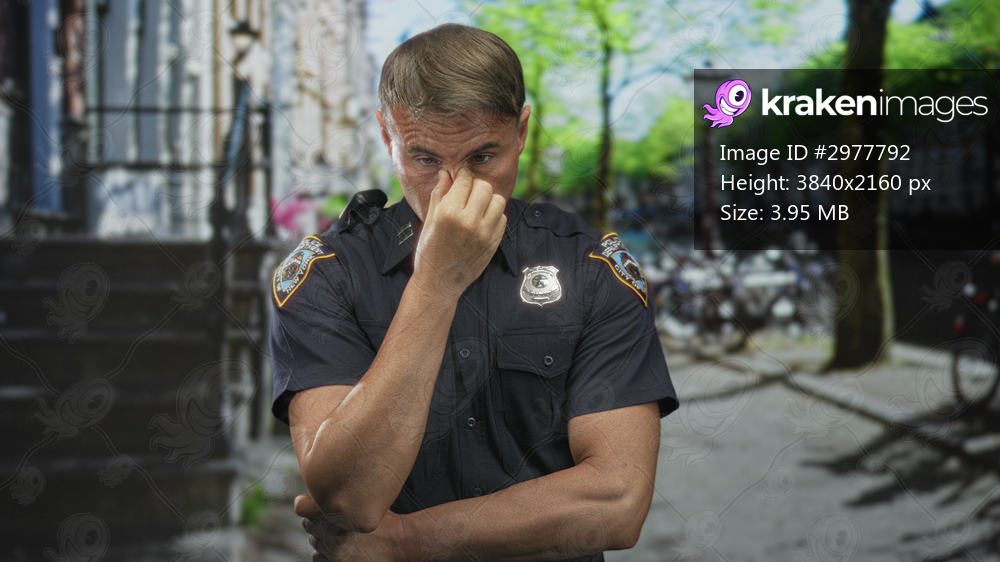 Police officer man pinches nose by visible badge on street with folded arms and navy uniform shirt; stress reflection.