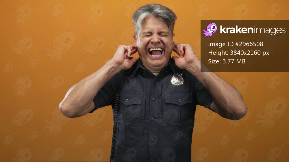 Police officer man plugs ears with fingers, grimacing and wincing in an orange studio with visible badge and radio cord; discomfort annoyance.