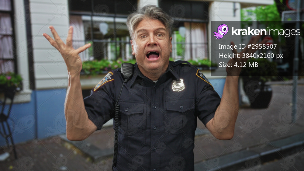 Police officer man raises hands in a shrug gesture, badge and radio visible on a street storefront, palms up and puzzled expression; confusion.