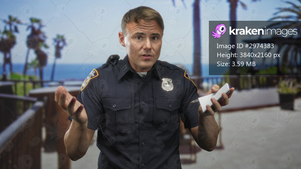 Police officer man shrugging with notepad and pen on a street boardwalk by the ocean; concern duty service.