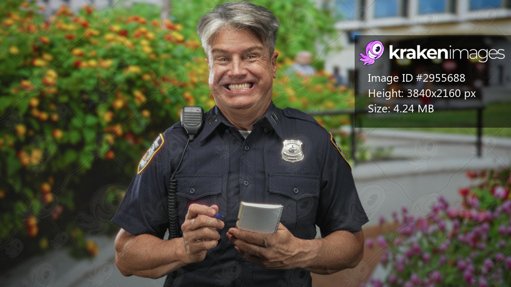 Police officer man writing in notepad at building entrance, smiling and holding radio while showing badge; friendly community service.