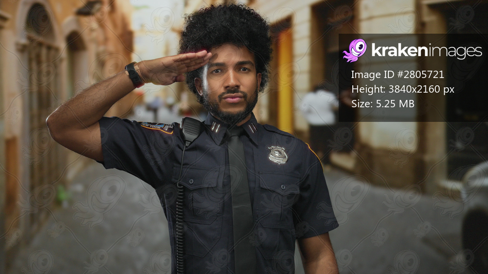 Police officer performs a salute on a city street, capturing focus with confident posture against a blurred urban backdrop.