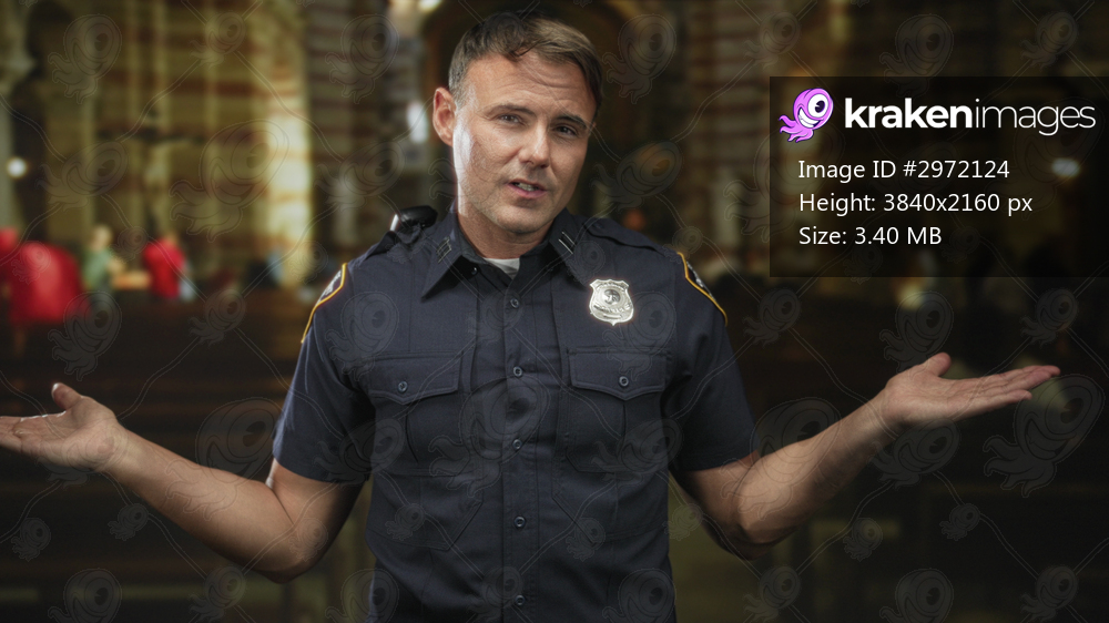 Police officer shrugs with palms up in a church building, badge visible while gesturing to empty pews; confusion doubt.