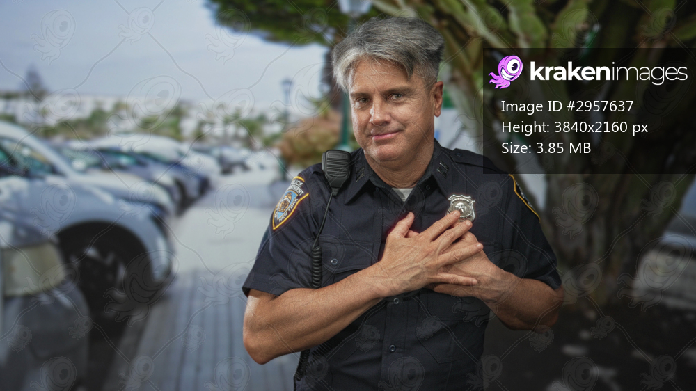Police officer with visible badge and hands on chest gesture in a street parking lot; duty compassion.