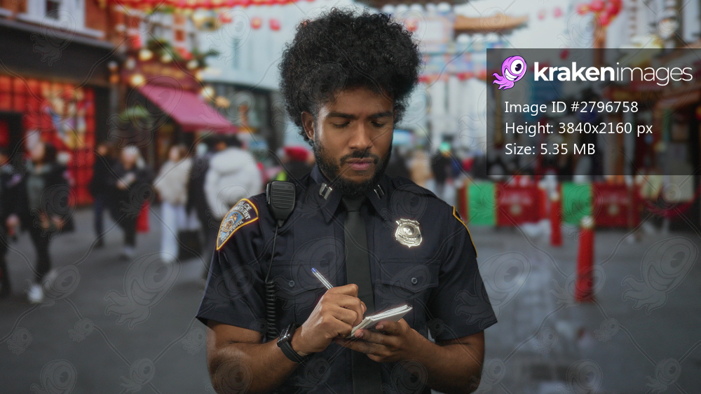 Police officer writing in notepad on busy city street with blurred pedestrians and colorful storefronts.