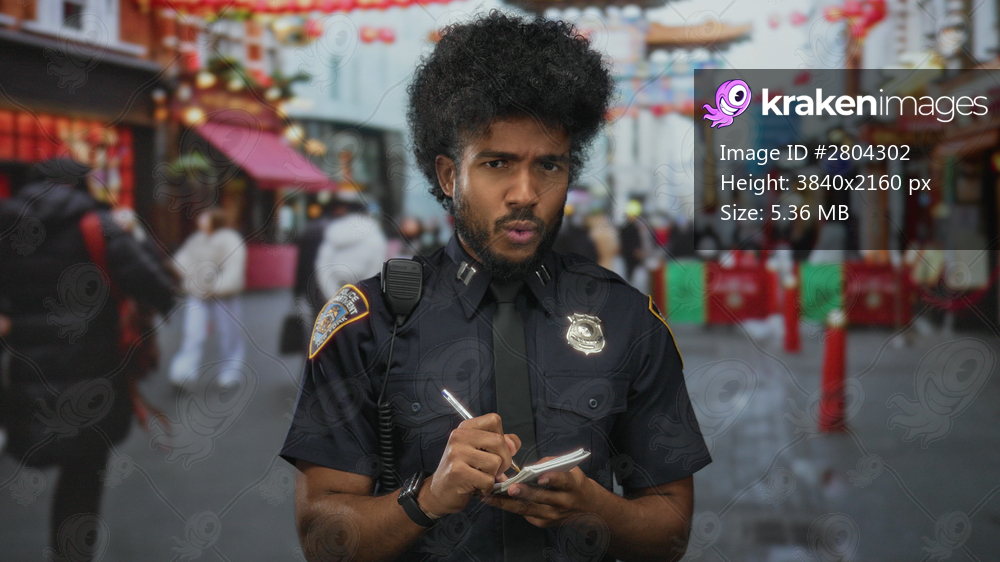 Police officer writing in notepad on busy city street with blurred pedestrians and colorful storefronts.