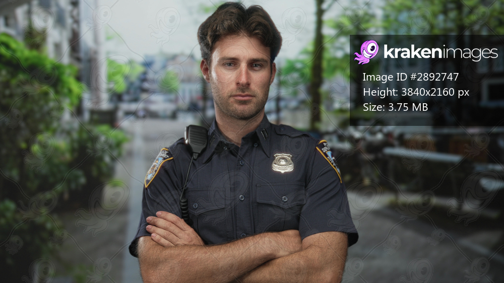 Policeman with badge and arms crossed on street by canal and bench, wearing dark uniform and shoulder radio; duty seriousness.