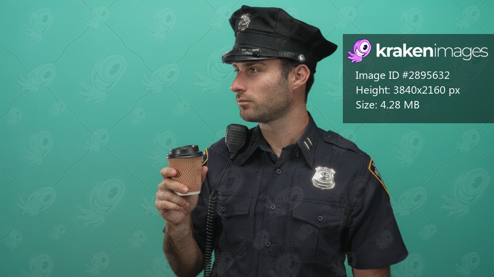 Policeman holding paper coffee cup with lid in right hand while wearing uniform and badge in teal studio; duty pause.