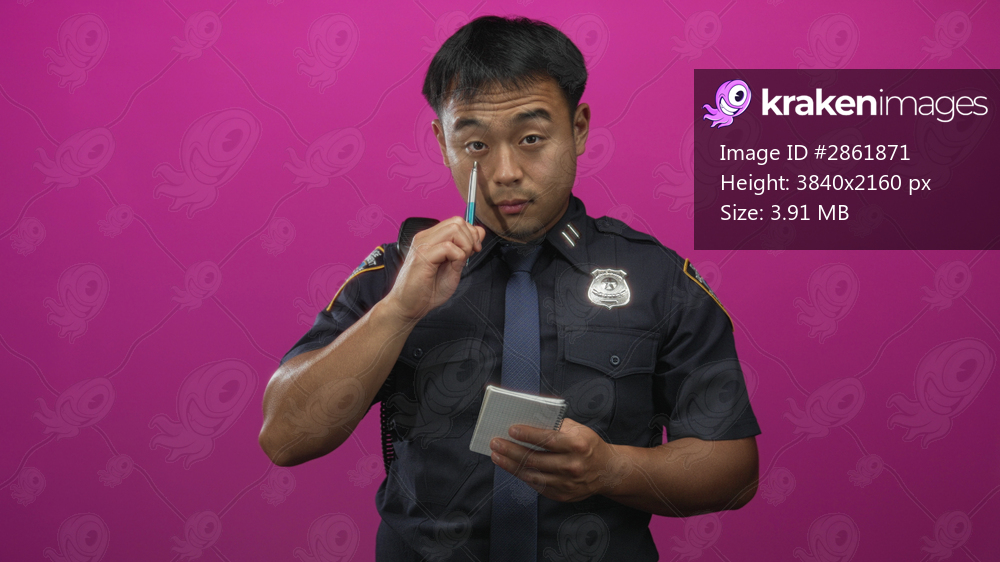 Policeman in navy uniform writing notes with pen on notepad in vibrant pink studio; concentration duty diligence.