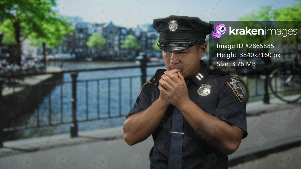 Policeman in uniform holds hands out near canal on a city street by iron railing with badge visible; cooperation.