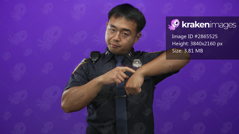 Policeman man pointing finger to bare wrist under his police badge in a purple studio setting; duty.