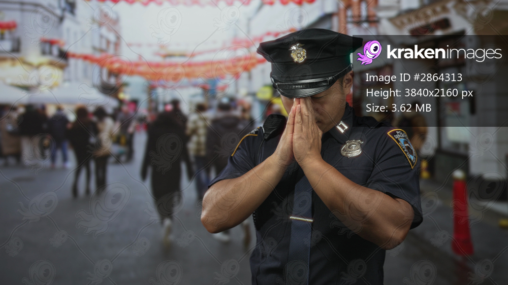 Policeman presses his hands together in prayer on a crowded city street with blurred pedestrians around; serenity.