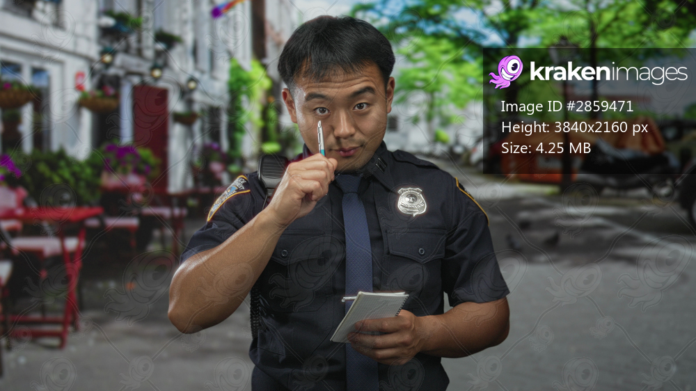 Policeman writing in small notepad with pen on tree lined city street near sidewalk cafe tables; dedication duty vigilance commitment.